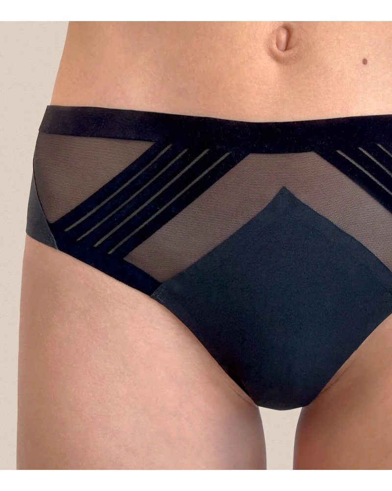 Le Tanga de sport pour Femme "N°23" de la marque HÄSTKO est ultra-confort, il est idéal pour le trail, le fitness, l'équitation, le tennis, le crossfit, le vélo, le golf... Un Tanga technique de sport qui n'oublie pas d'être élégant avec ses jeux de transparence en tulle stretch et ses finitions velvet touch. Il s'associe à merveille avec le BRA N°91, mais peut aussi être combinée au BRA N°38