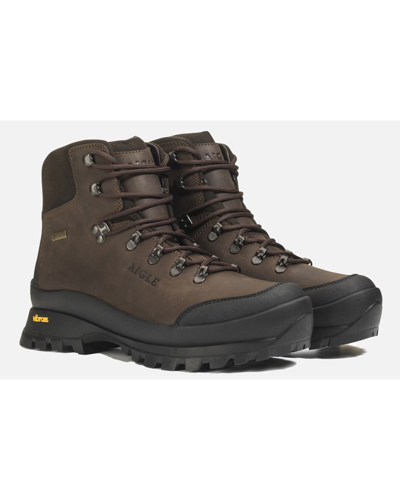 La paire de chaussure de randonnée pour homme "MUNTAGNA GTX" de la marque AIGLE cumule les bons points : cuir responsable imperméabilisé, semelle Vibram® tout confort, membrane Gore-Tex® étanche et respirante, col doublé en cuir et pare-pierres avant et arrière durables et résistants.