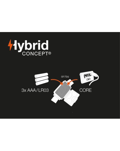 • - construction HYBRID CONCEPT : livrée avec trois piles AAA/LR03, TIKKINA est aussi compatible avec la batterie rechargeable CORE (non fournie). La lampe détecte automatiquement la source d'énergie et ajuste les performances d'éclairage,