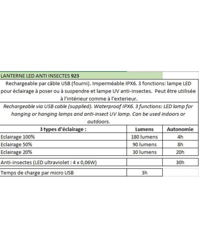 La lanterne LED anti insectes de la marque CAO OUTDOOR est imperméable IPX6, se recharge avec un cable USB (fourni). Elle offre 3 fonctions : lampe LED pour éclairage à poser ou à suspendre et lampe UV anti-insectes. Elle propose 3 types d'éclairage: 100% (180 lumens - 4h d'autonomie - éclairage à 30m), 50% (90 lumens - 8h d'autonomie - éclairage à 15m) et 20% (30 lumens - 20h d'autonomie - éclairage à 20m).