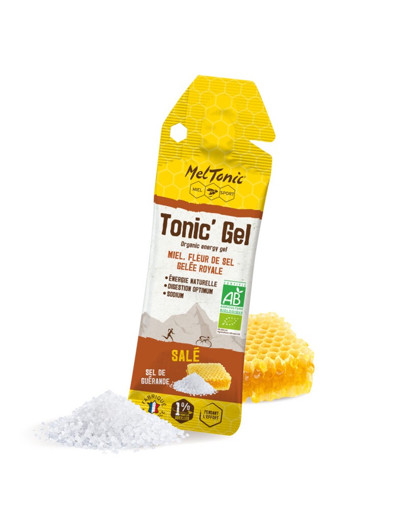 Le Gel Energétique Bio "Salé" de la marque MELTONIC associe les bienfaits du miel et de la gelée royale à la fleur de sel de Guérande pour stimuler l'organisme. Les gels énergétiques bio sont spécialement conçus pour des séances de sport de longues durées. La fleur de sel rentre en jeu pour éviter les risques de déshydratations (la fleur de sel aide le corps à absorber l'eau) chez le sportif. Variez les saveurs pendant l'effort et évitez les lassitudes alimentaires grâce à l'association du miel, de la gelée royale et de la fleur de sel !