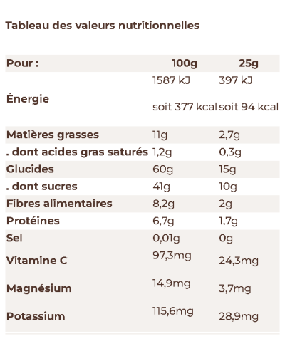 - Traces possible de : fruits à coque, sésame, soja, lait (lactose), gluten, arachides et oeuf.