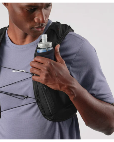 - 2 poches porte-gourdes frontales: Conçues pour accueillir les softflasks Salomon, ces poches avant réduisent l’effet de ballottement. Les boucles élastiques supérieures maintiennent parfaitement vos bouteilles à portée de main.
